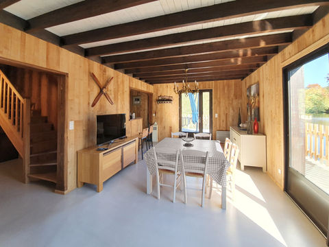 La grande terrasse en bois sur pilotis vous plonge dans un décor de carte postale : lever de soleil sur l'étang, repas en plein air avec plancha électrique, sieste dans le transat, apéro au bord de l’eau, pêche en no-kill de la terrasse... tout est là pour créer des vacances nature inoubliables.