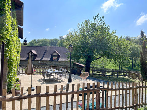 La grande terrasse clôturée vous offre une vue paisible sur le parc du moulin, idéale pour les repas en plein air ou simplement pour savourer la quiétude du lieu.